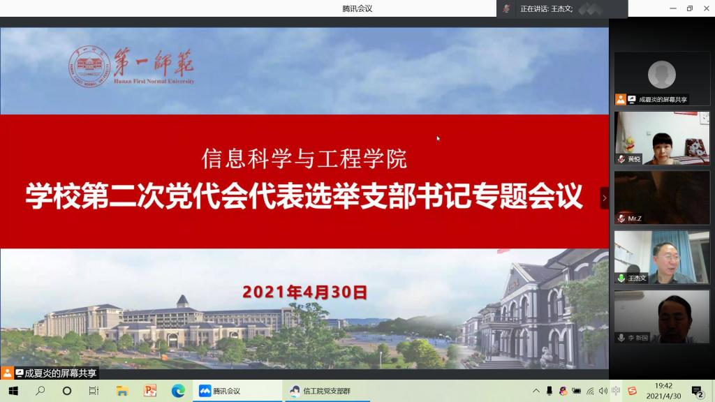 晚上19时30分,学院党总支借助腾讯会议平台召开了支部书记会议,党员学院领导、党总支委员、支部书记参加,会议由党总支副书记成夏炎主持。首先,党总支书记王杰文传达了学校、学院相关会议精神,简要介绍了本次党代会的背景、意义和任务,特别强调了代表选举纪律和要求。接着,成夏炎对我院选举党代表进行了部署。