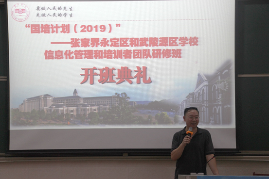 2019年8月2日讯(通讯员 周克江):8月2日,由我院承办的“国培计划(2019)”——张家界永定区和武陵源区学校信息化管理团队研修项目(C114),在湖南第一师范院鹤鸣楼南111教室隆重开班。继续教育学院院长曾小玲、本院总支书记王杰文、副院长田祖伟、副院长何向阳,永定区和武陵源区相关领导,培训班管理团队全体成员及60名学员参加了开班仪式。