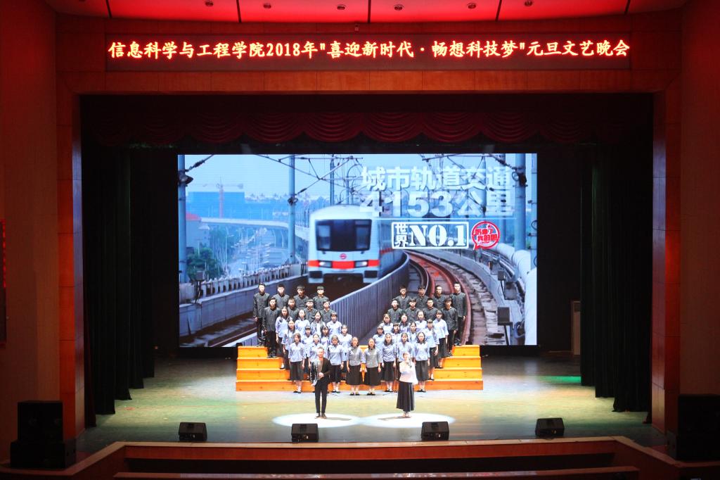 欢歌笑语辞旧岁,喜气洋洋迎新年。12月21日晚,信息科学与工程学院 “喜迎新时代·畅想科技梦”2018年元旦文艺晚会在东方红校区音乐剧场隆重举行。校党委书记彭小奇,校长助理、信息科学与工程学院院长李勇帆,学生工作处处长陈志武,现代教育技术中心主任朱承学,校团委办公室主任邓玉琴等应邀出席,信工学院全体师生及校友代表、学生家长代表、长沙航空职业技术学院学生嘉宾等1000余人共同观看了演出。