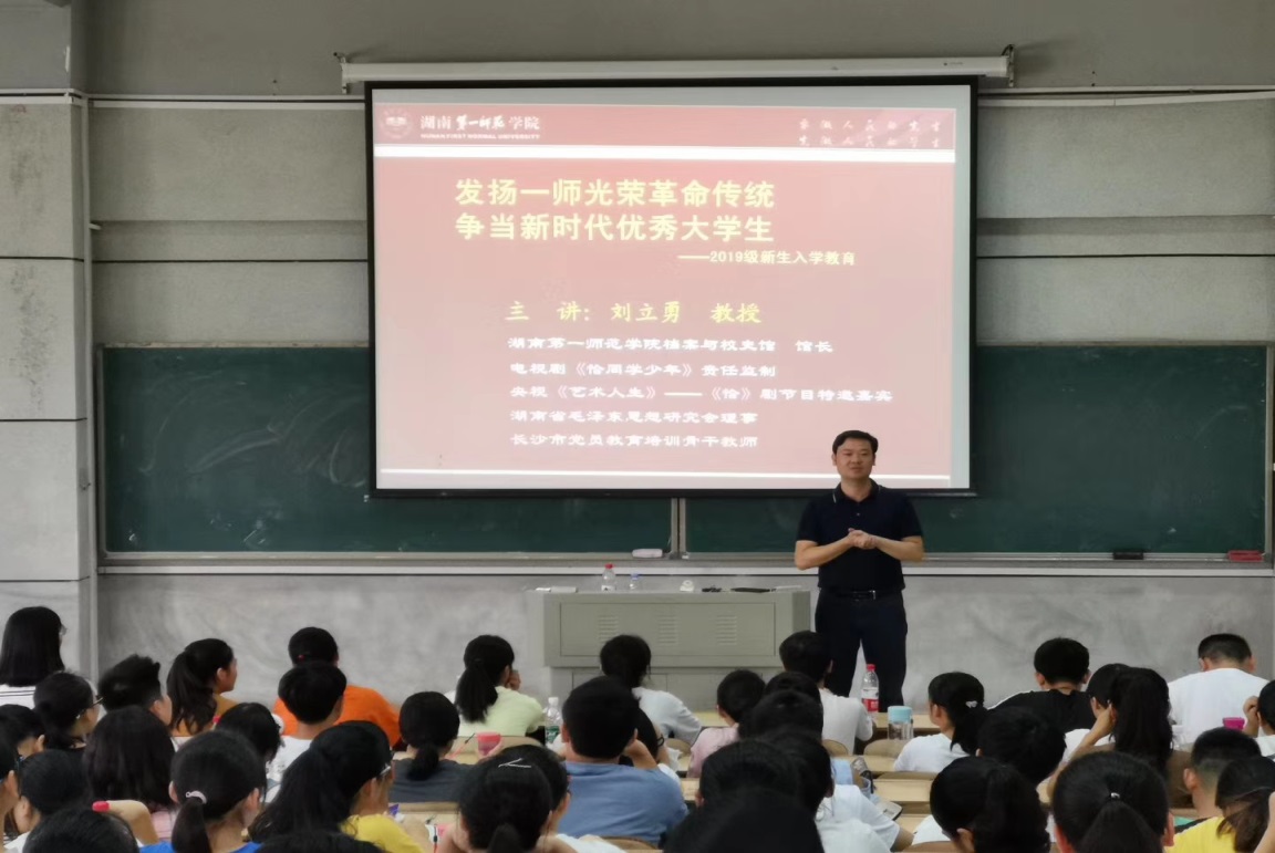 刘立勇教授为初来乍到的新生讲解了我校的发展历史以及伟大校友毛泽东在一师求学的故事,他教导新生要发扬一师光荣革命传统,争当新时代优秀大学生。