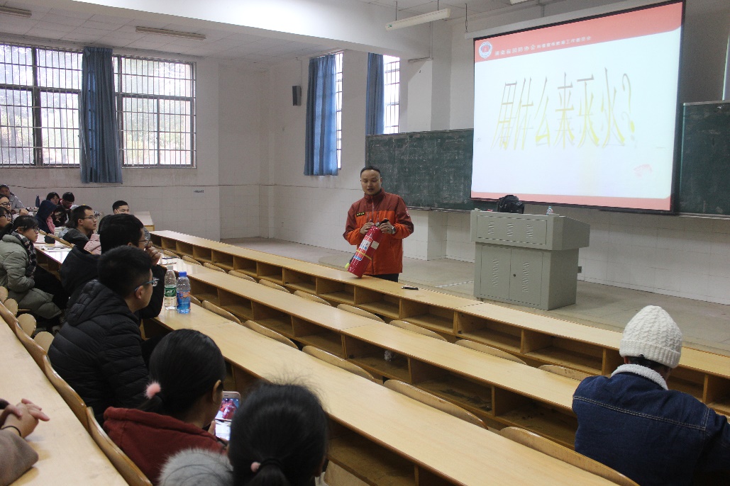 讲座上,吴教官通过一段案例视频分析指出大部分人因缺乏消防常识,很多时候造成了不必要的伤亡,告诫大家树立安全意识,掌握“小火懂灭火,大火懂逃生自救”的应急方法。随后,吴教官介绍了日常防火基本常识、逃生自救方法及消毒面具和灭火器的正确使用方法。吴教官强调,在面对突发火灾事件时,一定要先冷静,后做好防烟工作,快速有序地离开现场。而对于不能离开现场的情况,吴教官则介绍了几种躲藏的方式和地点及相应的求救信号。