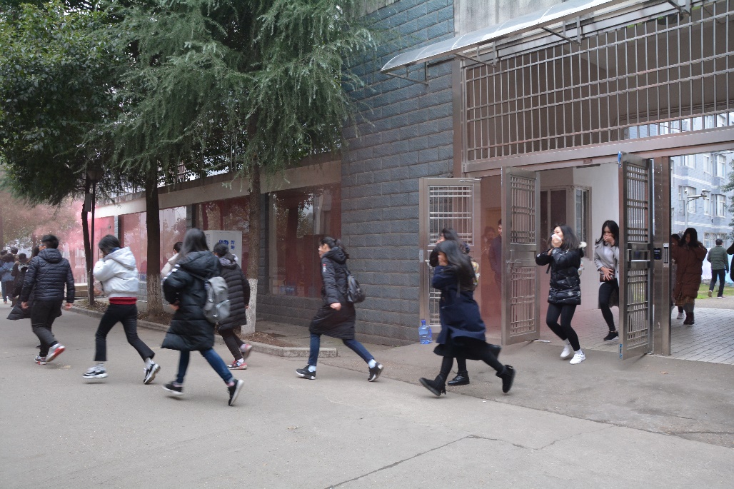 讲座后,为达到学以致用的效果,提高学生们应对火灾突发事件的自救能力,我院于学生公寓12栋组织了一场应急疏散逃生演习。紧张的逃生警报一响,浓烟之中,在各工作人员的指导下,300余名学生1分钟之内快速有序地从“火灾”现场撤离,安全抵达田径场。
