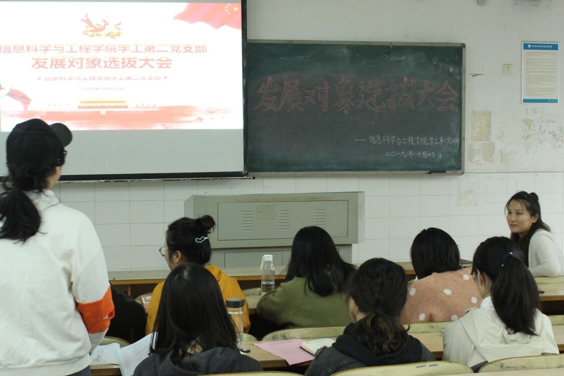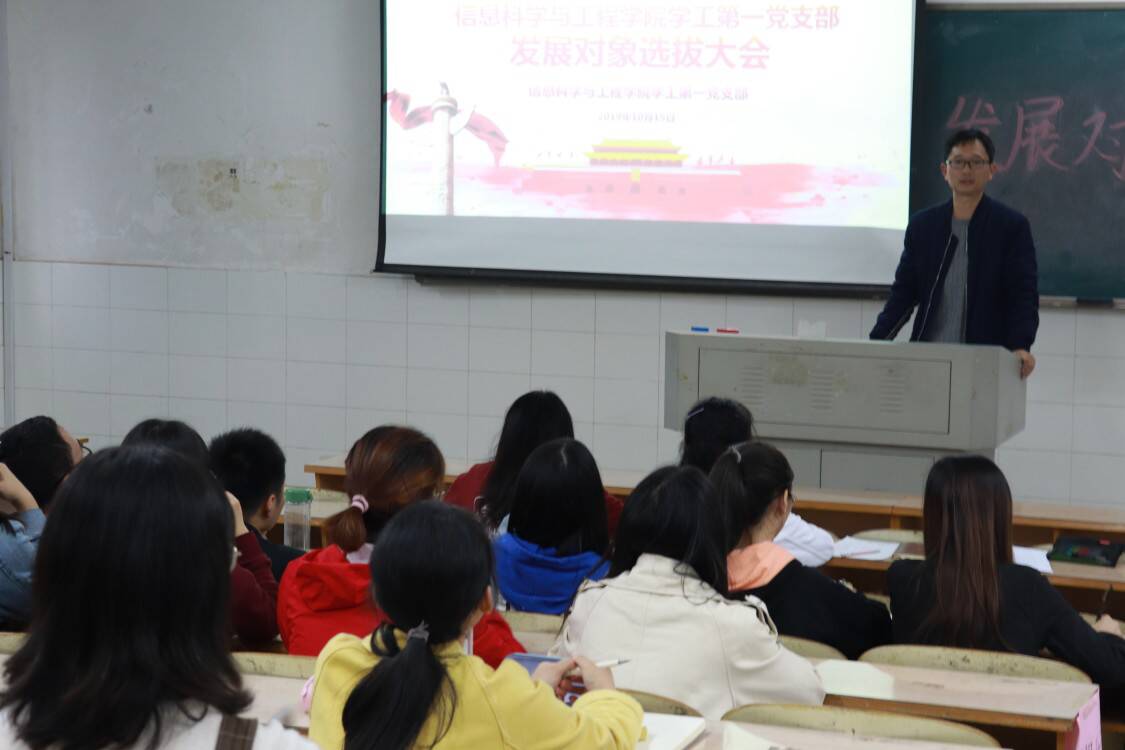 (通讯员 邓世骄 蒋郑菊)为进一步落实我院党组织对优秀人才的选拔工作,深入了解积极分子的思想动态,10月15日下午,信息科学与工程学院学工第一党支部、第二党支部于玉衡楼北栋507、508顺利召开发展对象选拔大会。学工第一党支部书记关红儒同志、学工第二党支部书记唐瑞鸿同志、部分学生党员及33名入党积极分子参加此次会议。