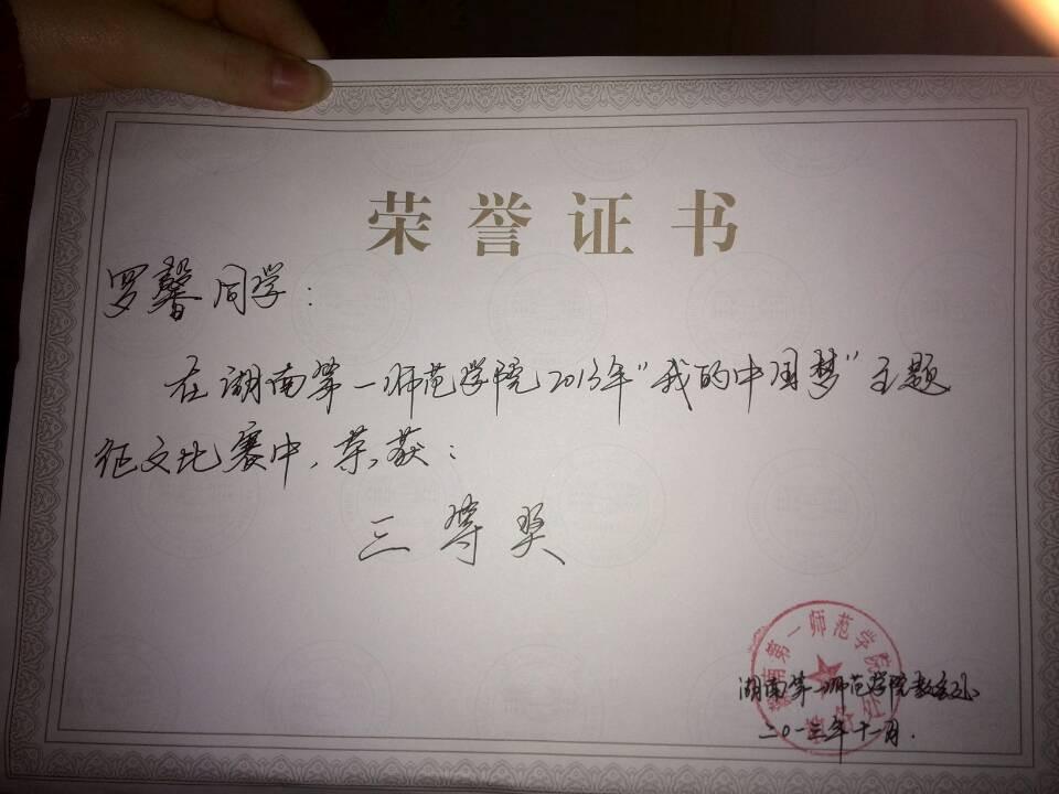 2013年伟德国际1949“我的中国梦”主题征文比赛中,罗馨荣获此次比赛三等奖。罗馨表示通过这次比赛不仅锻炼了自己的能力,同时让她更加清晰的了解了自己。她希望自己今后能够参加更多类似的比赛,并且取得更好的成绩。