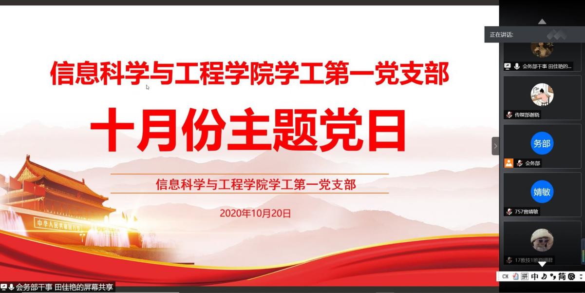 2020年10月20日,我院学工第一、第二党支部分别采取线上与线下结合的方式开展主题党日活动,活动由王丹、周应坚主持。我院党总支副书记成夏炎、学工第一党支部书记关红儒、学工第二党支部书记李荣敬、学工办老师唐瑞鸿、叶晶以及部分学生党员参加此次活动。