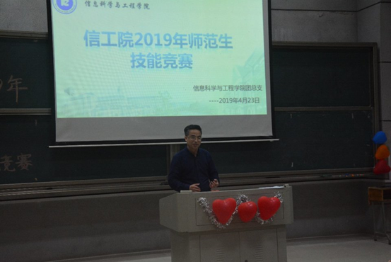 (通讯员 邓力超 肖丽菲)为强化我院师范专业学生的教师职业技能,提高师范生教育教学能力,进一步促使广大同学更新教育理念和激发其掌握现代教学方法的热情,信息科学与工程学院于2019年4月16日—4月23日成功举办2019年师范生教师技能竞赛。并于4月23日下午6:30—22:00在润寰南106进行了现场授课决赛。学院副院长田祖伟教授、党总支副书记易利老师、学工办主任关鸿儒老师及学院教师代表阳西述教授、何昭青教授、何向阳教授、黄悦副教授和刘琳老师出席比赛并担任评委。