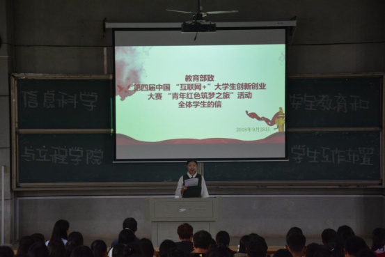 紧接着,学院2018年暑期三下乡新航向梦之队队长王伦分享了一段详尽温情的支教扶贫视频,就暑期伟德国际1949赴汝城县教育帮扶关爱团的活动情况进行了汇报,并恳切希望各班班干部能够群策群力,积极号召班级同学,支持三下乡活动。学生代表欧阳欣满怀激情地朗读了《教育部致第四届中国“互联网+”大学生创新创业大赛“青年红色筑梦之旅”活动全体学生的信》,教育部在回信中转达习近平总书记的亲切问候,勉励大学生将自身青春梦融入国家中国梦中,共同实现中华民族伟大复兴,传递了当代青年“敢闯会创”的蓬勃朝气。