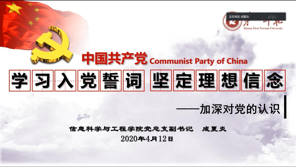 (通讯员 蒋郑菊 邓世骄)4月12日19时,我院党总支副书记成夏炎通过腾讯会议平台,以“学习入党誓词,坚定理想信念——加深对党的认识”为主题,为我院分党校和数学与计算科学学院分党校联合举办的第二十四期入党积极分子培训班的学员上党课。