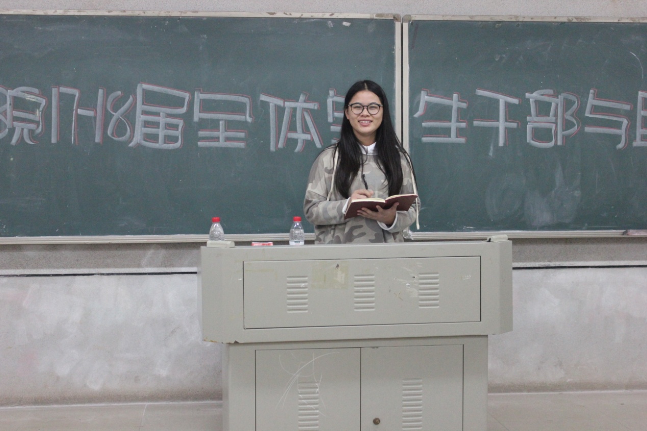 接着,学生会主席胡思婷、办公室主任冯靖雯、青志协主席丁娇、秘书部部长朱珍萍相继上台发言。胡思婷希望每一位助干都要处理好学习和工作之间的关系,始终保持对工作的热情,并在工作、与人交往的过程中找到归属感。工作要细心、勇敢,其次给自己确定一个小目标,并为之努力。冯靖雯主要对下周的青马课程安排做了详细介绍,同时,她希望每位助干都要有礼貌,学会尊重、包容和坚持。丁娇则强调助干要认真向各班级传达志愿者注册的事项,并建议助干们要有时间观念,提高工作效率,学会创新。朱珍萍对办公室值班安排及注意事项做了详细的讲解。