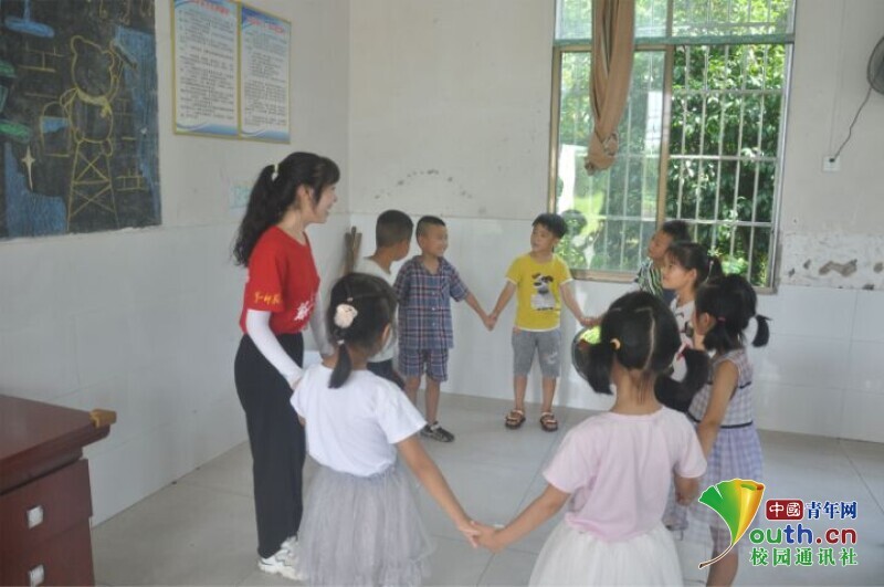 图为队员和孩子们手拉手进行趣味小游戏。中国青年网通讯员 马唯一摄