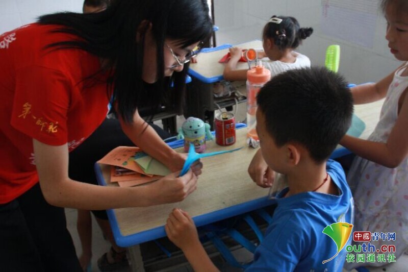图为实践队员耐心地教孩子们进行折纸。中国青年网通讯员 欧阳健 摄