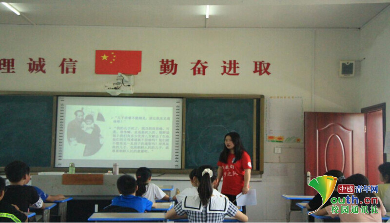 图为志愿者向学生讲述关于毛主席的儿子毛岸英的故事,学生们深受触动。中国青年网通讯员 何星逸 摄