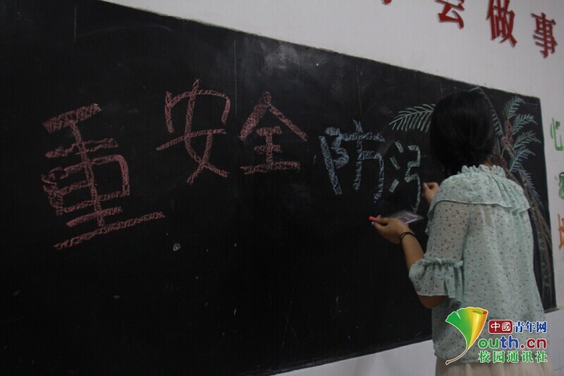 图为新航向·梦之队队员于防溺水主题课前一晚准备相关主题黑板报。中国青年网通讯员欧阳健 摄