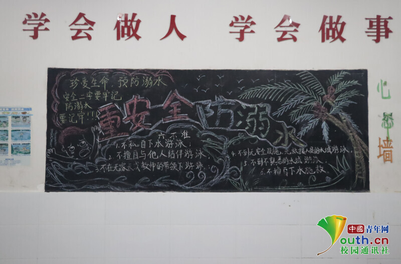 图为新航向·梦之队队员手绘的防溺水主题黑板报。中国青年网通讯员 祝勇 摄