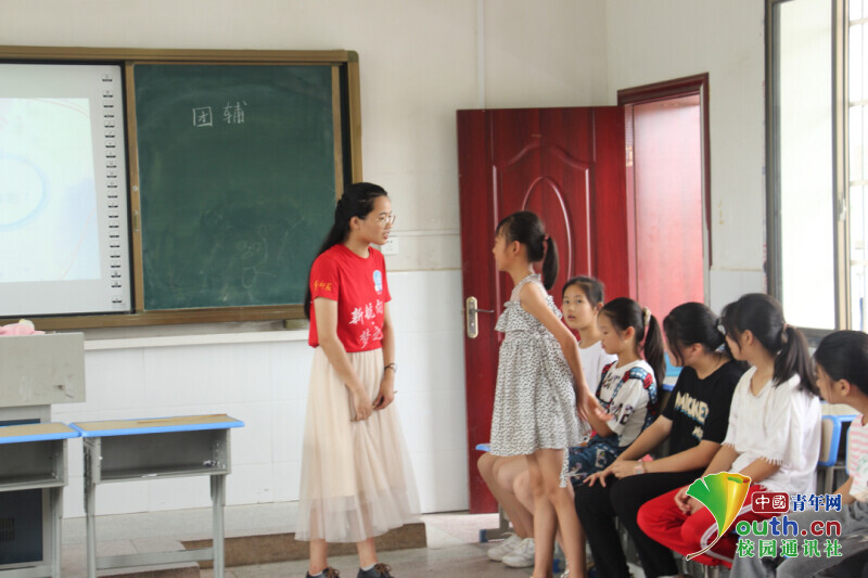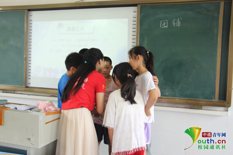图为心理团辅课上志愿者老师组织班级同学分工合作开展游戏,通过游戏来体会团体的力量。中国青年网通讯员 段新利 摄