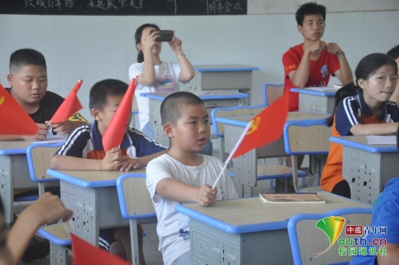 图为孩子们挥舞着党旗齐唱《没有共产党就没有新中国》。中国青年网通讯员 欧阳健 摄