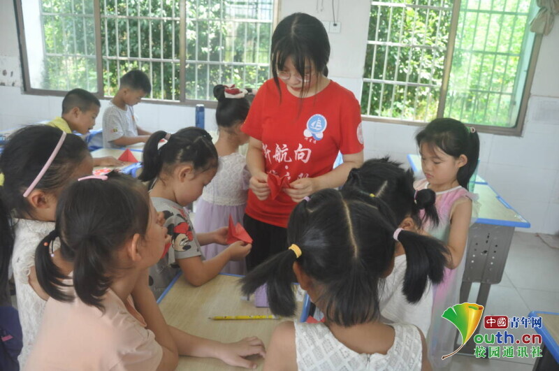图为手工课志愿者正在与学生互动折纸。中国青年网通讯员 马唯一 摄