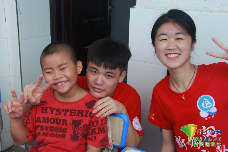 图为 小朋友在与新航向·梦之队队员和老师的交谈中忽然发现镜头,开心的比了一个“耶”。中国青年网通讯员 段新利 摄