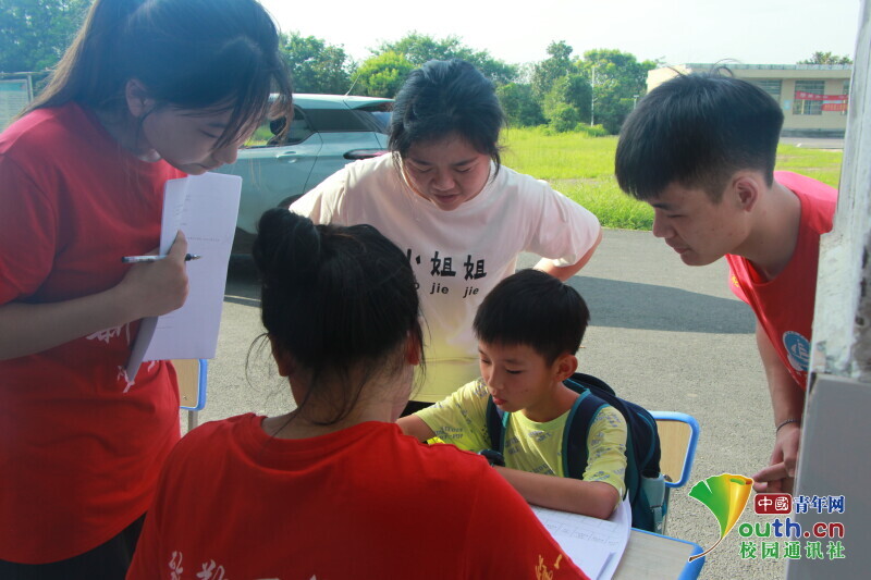 图为 小朋友们在新航向·梦之队队员们的指导下填写报名表。中国青年网通讯员 何星逸 摄
