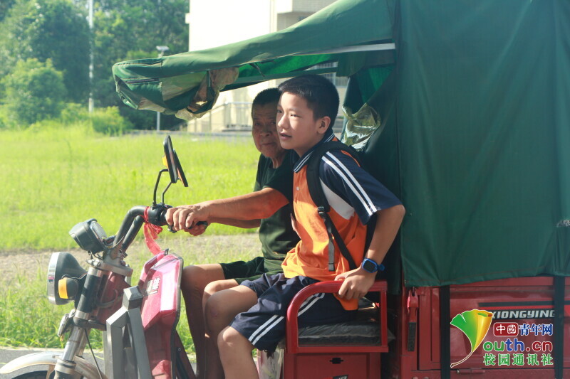 图为 七旬老人不惧炎热用三轮车送孩子报到。中国青年网通讯员 何星逸 摄