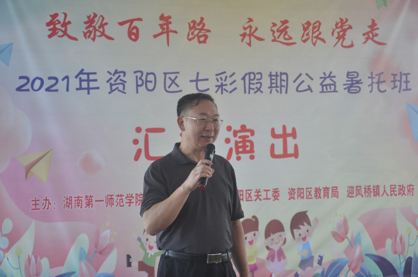 7月23日上午,由我院“三下乡”社会实践团举办的“致敬百年路,永远跟党走”文艺汇演在长塘仑小学举行。莅临演出现场的领导和嘉宾有迎风桥镇党委书记谭莹,镇党委副书记、镇长肖博,团区委书记曾晴阳,迎风桥镇中心学校校长罗立强,长塘仑小学校长黄小毛,学院党总支书记王杰文,副书记成夏炎,党总支委员、副院长田祖伟,副院长何向阳,党总支委员、学工办主任关红儒,团总支书记、团队带队老师李荣敬。