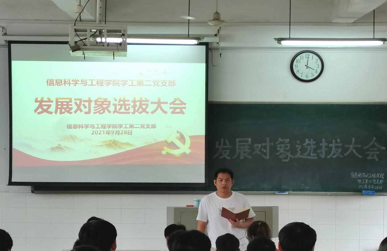 2021年9月28日,我院学工第一、第二党支部通过线上与线下结合的方式召开本次发展对象选拔大会。与会人员有学工第二党支部书记李荣敬,全体学生党员和51名入党积极分子。大会分别由苏琴、张旭主持。