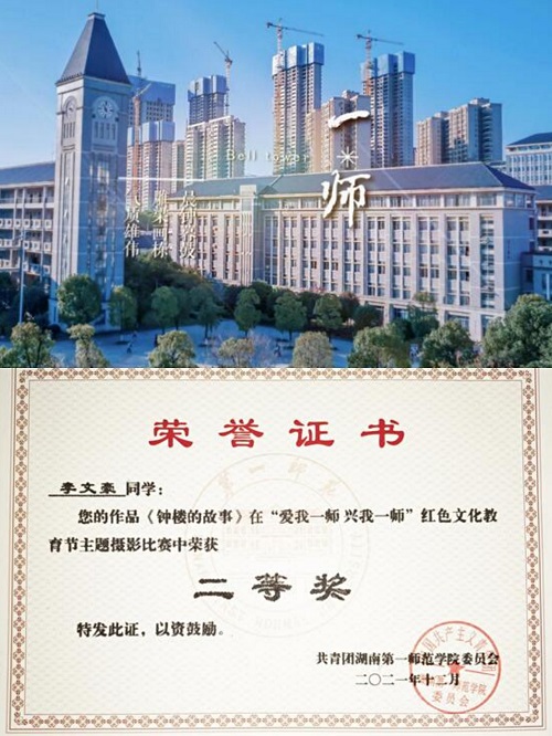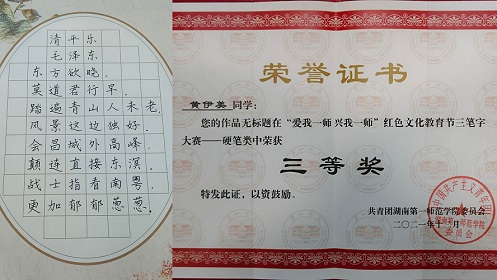 此次红色文化教育节还包括三笔字比赛、征文比赛、摄影比赛。获奖优秀作品在颁奖典礼现场陈列展出。我院19级818教技班李文豪的摄影二等奖作品《钟楼的故事》,20级848教技班黄伊美的三笔字(硬笔)比赛三等奖作品《清平乐》陈列其中。