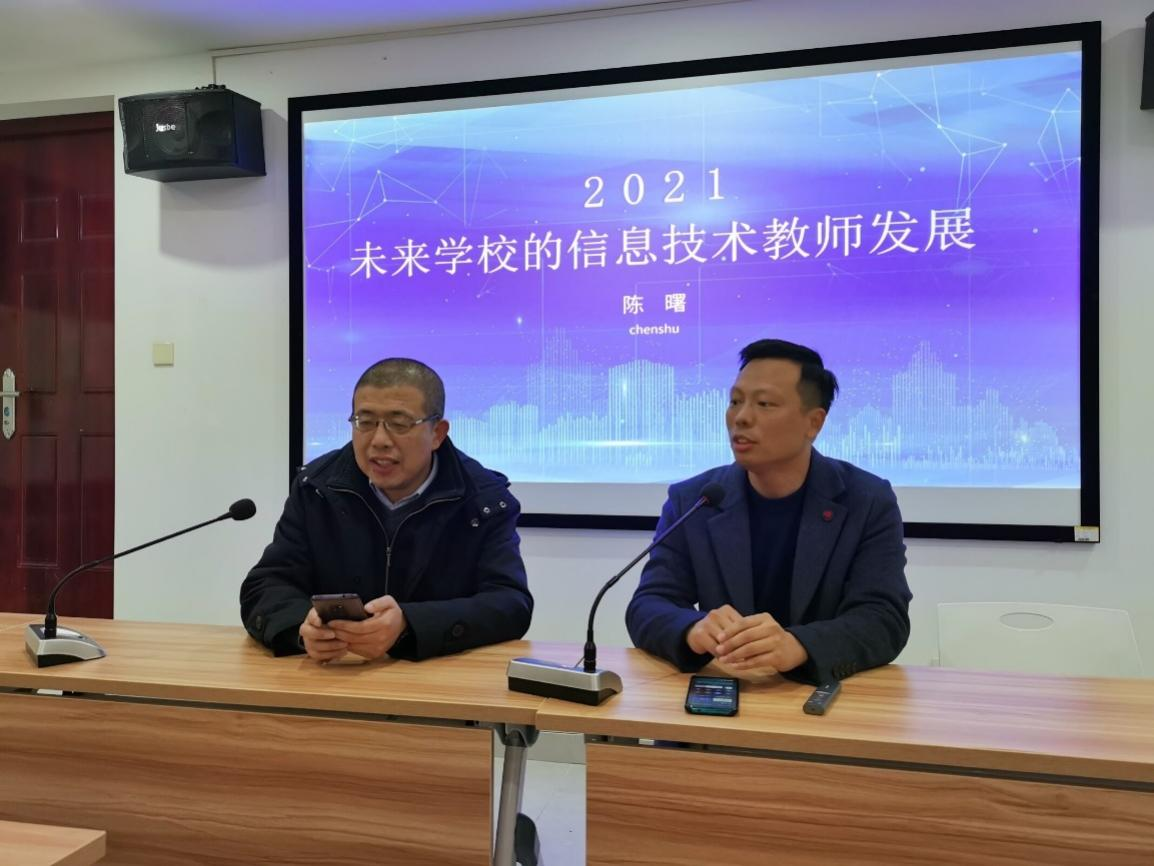 为了让六年制教育技术学专业师范生对未来学校和信息技术教师的专业发展有更明确的认识,全面了解中国现代化教育的规划,激励学生充分利用在校时间努力提升相关专业素养。2021年12月8日下午,岳麓区实验小学陈曙校长在双创楼414为我院师生开展了“未来学校的信息技术教师专业发展”的专题讲座。讲座由何向阳副院长主持,院党委书记刘立勇,院长满君丰,学院教师黄悦、刘琳、张卓林及19级817、818教技班学生参加了本次活动。