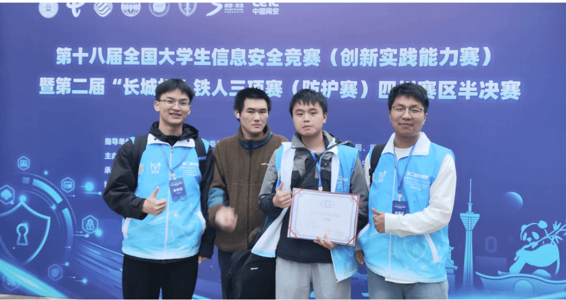 本届赛事聚焦实战化攻防对抗与综合渗透能力,创新采用AWDP(Attack·With Defense·Preparation)与ISW(Integrated·Security·Work)双赛道模式。通过攻防兼备的赛制设计,旨在以赛促学、以赛育才,全面推动高校教育、科技、人才一体化发展。由我院周文杰、许强、徐鹏、刘坤浩四位同学组成的参赛队,经过层层选拔晋级半决赛,最终凭借扎实的技术功底与创新思维,在激烈角逐中脱颖而出,荣获四川赛区三等奖。
