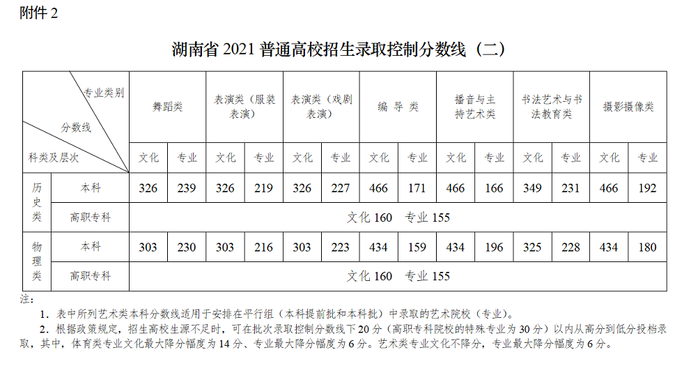 湖南省2021普通高校招生录取控制分数线