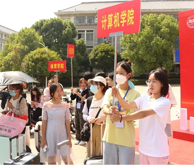 图为迎新志愿者在校门口等待着新生的到来,以良好的精神面貌迎接新生